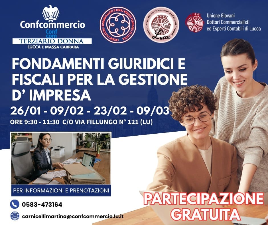 Fondamenti giuridici e fiscali per la gestione d’impresa: approfondimenti gratuiti con Terziario Donna“𝗙𝗼𝗻𝗱𝗮𝗺𝗲𝗻𝘁𝗶 g𝗶𝘂𝗿𝗶𝗱𝗶𝗰𝗶 𝗲 f𝗶𝘀𝗰𝗮𝗹𝗶 𝗽𝗲𝗿 𝗹𝗮 𝗴𝗲𝘀𝘁𝗶𝗼𝗻𝗲 𝗱'𝗶𝗺𝗽𝗿𝗲𝘀𝗮”: arriva il nuovo ciclo di approfondimenti gratuiti per tutte le imprese, organizzati dal Terziario Donna Confcommercio Lucca e Massa CarraraLe lezioni si svolgeranno nella sede di Confcommercio Lucca e Massa Carrara in via Fillungo 121, dalle 9,30 alle 11,30.Si parte il 26 gennaio e si continua in data 9 e 23 febbraio, per poi concludere il 9 marzo.Le attività sono svolte in collaborazione con l’Ordine dei dottori commercialisti ed esperti contabili di Lucca e l’Unione giovani commercialisti Lucca𝗣𝗲𝗿 𝗽𝗿𝗲𝗻𝗼𝘁𝗮𝗿𝘀𝗶 𝗰𝗼𝗻𝘁𝗮𝘁𝘁𝗮𝗿𝗲 𝘀𝘂𝗯𝗶𝘁𝗼 𝗜 𝗻𝗼𝘀𝘁𝗿𝗶 𝘂𝗳𝗳𝗶𝗰𝗶 allo 0583/47311.
