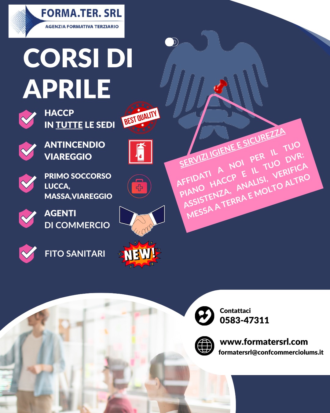 Primo soccorso, agente di commercio, fitosanitari: i nostri corsi nel mese di aprileCon il mese di aprile ancora tanti corsi a cura di FormaTer, agenzia formativa di Confcommercio Province di Lucca e Massa Carrara. Eccoli nel dettaglio.HACCP: Mettiti in regola. Siamo presenti in tutte le sedi: Lucca, Massa, Castelnuovo e Viareggio. Ricorda l'obbligo di aggiornamento per i responsabili entro maggio 2026 per allinearsi alla nuova normativa. Non ridurti all'ultimo momento.ANTINCENDIO: Prossima data a Viareggio PRIMO SOCCORSO: Corsi in partenza su Lucca e Massa DIVENTA AGENTE DI COMMERCIO Vuoi dare una svolta alla tua carriera? Dal 21 aprile al via il nuovo percorso abilitante per aspiranti agenti e rappresentanti di commercio. FITOSANITARI Aggiornamento obbligatorio per gli utilizzatori di prodotti fitosanitari. La tua sicurezza in campo è la nostra priorità. Per maggiori info ed iscrizioni: 0583/47311 formatersrl@confcommerciolums.it
