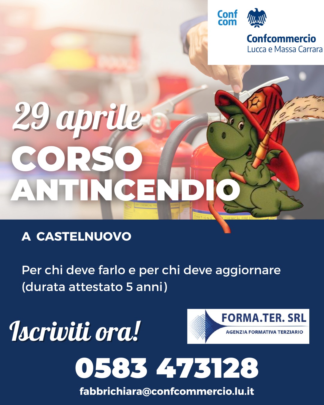 Un nuovo corso antincendio nella nostra sede di Castelnuovo GarfagnanaForma.Ter Srl, agenzia formativa di Confcommercio Lucca Massa Carrara, informa che sono aperte le iscrizioni per un nuovo corso in materia di antincendio, in programma nella nostra sede di Castelnuovo Garfagnana mercoledì 29 aprile alle 14. Il corso, obbligatorio per gli adempimenti di legge, è rivolto sia a chi deve ottenere l'abilitazione per la prima volta, sia a chi deve effettuare l'aggiornamento quinquennale (l'attestato antincendio scade infatti ogni 5 anni).Per tutti i dettagli su orari e iscrizione, contatta i nostri uffici (referente Chiara Fabbri - 0583 473128, fabbrichiara@confcommercio.lu.it).