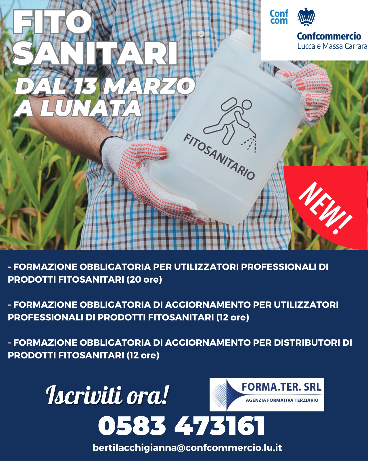Un nuovo corso di formazione per utilizzatori e distributori di prodotti fitosanitariFormaTer Srl, agenzia formativa di Confcommercio province di Lucca e Massa Carrara, rende noto che sono aperte le iscrizioni per un nuovo corso dedicato all’utilizzo di prodotti fitosanitari.Tre i percorsi proposti:- corso intero (20 ore), per utilizzatori professionali;- aggiornamento (12 ore), per utilizzatori professionali;- aggiornamento (12 ore), per distributori.Il corso si svolgerà nella sede dell’Associazione di Lunata (Capannori), in via della Madonnina, 33/B, prendendo il via il prossimo 13 marzo.Per info e iscrizioni, è possibile contattare gli uffici di Confcommercio (referente Gianna Bertilacchi, 0583/473161 - bertilacchigianna@confcommercio.lu.it).
