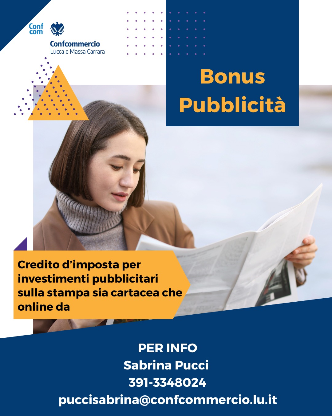 Bonus pubblicità 2026 per le aziende: ecco quali sono i criteri per usufruirneConfcommercio Province di Lucca e Massa Carrara rende noto come sia confermato anche per quest'anno il credito d’imposta per gli investimenti pubblicitari. Ecco cosa c’è da sapere.DATE IMPORTANTIDall’1 al 31 marzo 2026, invio della domanda di accesso.Gennaio 2027: Conferma degli investimenti effettuati.COSA È AGEVOLABILEPubblicità su giornali quotidiani e periodici (cartacei o online); le testate devono essere registrate con un direttore responsabile; vale solo per l'acquisto dello spazio pubblicitario.COSA È ESCLUSOTv, radio, social network, motori di ricerca, volantini, brochure e cartellonistica.COME FUNZIONA IL BONUSIl credito d'imposta è pari al 75 per cento della spesa incrementale.Requisito: l’impresa deve aver investito sulla stampa anche nel 2025. La spesa del 2026 deve superare quella del 2025 di almeno l'1 per cento.Attenzione: chi non ha fatto pubblicità su stampa nel 2025, non puoi accedere al bonus.PER INFO E PRATICHEContatta Sabrina Pucci: 391 3348024 – puccisabrina@confcommercio.lu.it.