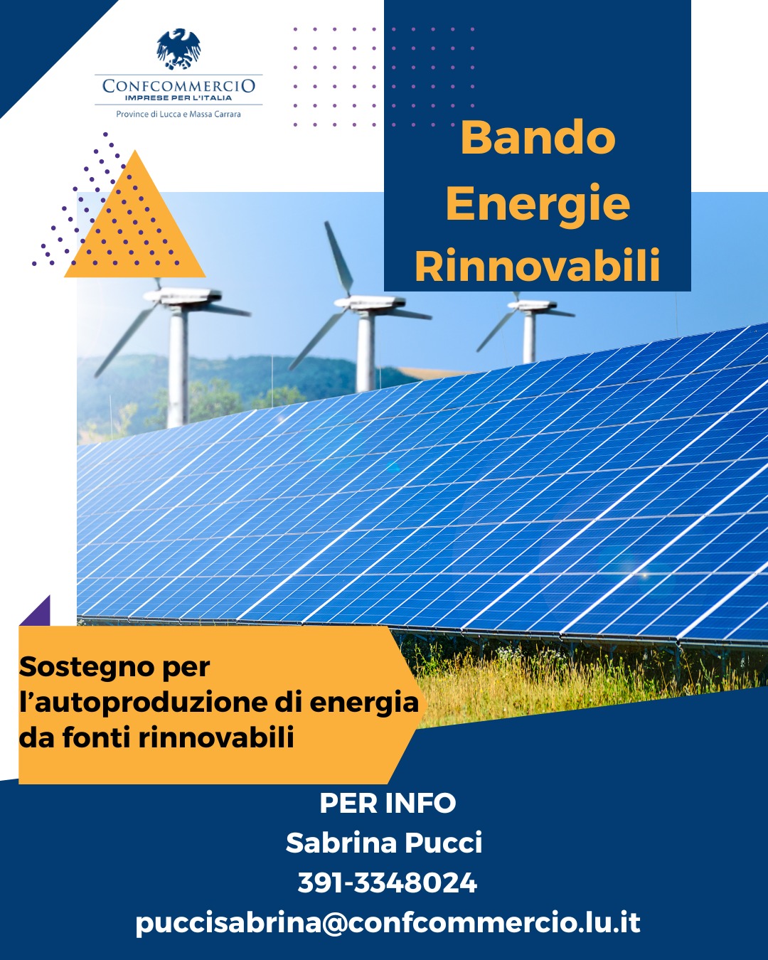 Energie rinnovabili, prorogato al 10 novembre il bando a fondo perduto per le piccole e medie imprese E’ stato prorogato alle 12 di lunedì 10 novembre il termine per presentare le domande per il bando Invitallia riservato alle energie rinnovabili per le piccole e medie imprese.Nello specifico, la misura sostiene le piccole e medie imprese che vogliano investire in impianti solari fotovoltaici o mini eolici per l’autoproduzione di energia, anche con sistemi di accumulo per autoconsumo.Il bando è aperto tutte le Pmi italiane, escluse quelle dei settori carbonifero e agricolo primario, precedendo contributi a fondo perduto per investimenti compresi fra i 30 mila euro e 1 milione di euro, in percentuali fino ad un massimo del:40% per micro e piccole imprese30% per medie imprese30% per sistemi di accumulo50% per la diagnosi energetica ex anteUn’occasione per ridurre i costi energetici e rendere la tua impresa più sostenibile.Per informazioni e assistenza è possibile contattare gli uffici del credito di Confcommercio Imprese per l’Italia Province di Lucca e Massa Carrara (referente Sabrina Pucci – puccisabrina@confcommercio.lu.it; 39103348024).