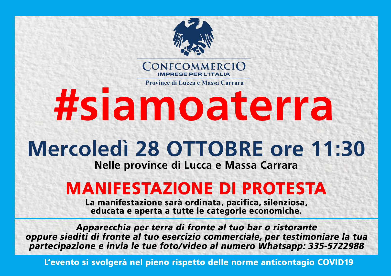 #siamoaterra: anche Confcommercio aderisce alla giornata nazionale di protesta lanciata da FipeCi sarà anche la partecipazione di Confcommercio Imprese per l’Italia – Province di Lucca e Massa Carrara alla manifestazione #siamoaterra promossa a livello nazionale da Fipe, la federazione dei pubblici esercizi che fa parte del sistema Confcommercio. Mercoledì mattina alle 11,30 andrà in scena in contemporanea un sit in che riguarderà 18 diverse città italiane fra le quali – per la Toscana – Firenze. Una protesta che vedrà i gestori dei pubblici esercizi radunarsi nelle piazze (per quanto riguarda Firenze il ritrovo è fissato in piazza del Duomo) e mettere simbolicamente a terra un “coperto”, ad indicare come l’ultimo Dpcm abbia messo a terra una intera categoria e decine di migliaia di imprese. Confcommercio Lucca e Massa Carrara coglie l’occasione per invitare tutti gli imprenditori del settore dei pubblici esercizi che non potranno essere presenti a Firenze a fare comunque lo stesso, deponendo per 10 minuti un “coperto” a terra all’esterno della rispettive attività. Una protesta che Confcommercio invita poi a rilanciare con foto e video sui social con il tag @Confcommercio Lucca e Massa Carrara, in modo così da dar vita a una lunga scia di immagini e riprese capaci di illustrare la rabbia e la preoccupazione dei nostri imprenditori. Confcommercio invita comunque a partecipare all’iniziativa anche i commercianti di altri settori, chiedendo loro di mettersi a loro volta simbolicamente a terra per qualche minuto, nella certezza che la battaglia per la sopravvivenza del mondo del commercio riguardi tutti i settori e non soltanto uno in particolare. IL MANIFESTO NAZIONALE DELLA GIORNATALA LOCANDINA DELLA NOSTRA INIZIATIVA