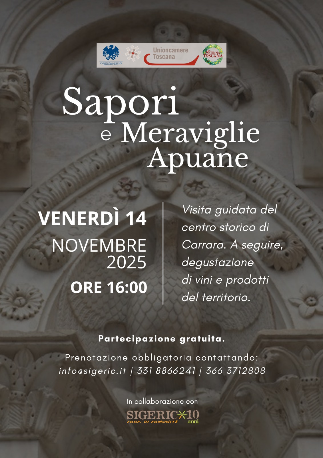 Ultimo appuntamento con “Sapori e meraviglie Apuane”, alla scoperta dei tesori e delle bellezze di CarraraTorna a Carrara l’appuntamento con “Sapori e meraviglie Apuane”: venerdì 14 novembre è infatti in programma la terza e ultima tappa dell’iniziativa organizzata da Confcommercio province di Lucca e Massa Carrara nell’ambito del cartellone di Vetrina Toscana, portato avanti dalla Regione con il sostegno di Unioncamere Toscana. La giornata, a partecipazione gratuita, prevede il ritrovo alle 16 e il successivo via a una visita guidata nel centro storico di Carrara, alla scoperta di scorci unici e spesso conosciuti ai più, in un mix senza pari di storia, arte e cultura. L’appuntamento di venerdì 14 arriva dopo l’ottimo successo di pubblico e gradimento delle due precedenti giornate svoltesi nel corso dell’estate. Anche stavolta al termine della passeggiata è previsto un aperitivo – degustazione per i presenti a base di vini prodotti tipici locali. La partecipazione all’evento come detto è gratuita, ma con prenotazione obbligatoria da effettuare rivolgendosi alle guide turistiche di Sigeric, importante realtà del territorio che collabora all’organizzazione della giornata. Per prenotarsi è necessario contattare i numeri di telefono 3318866241 o 3663712808.