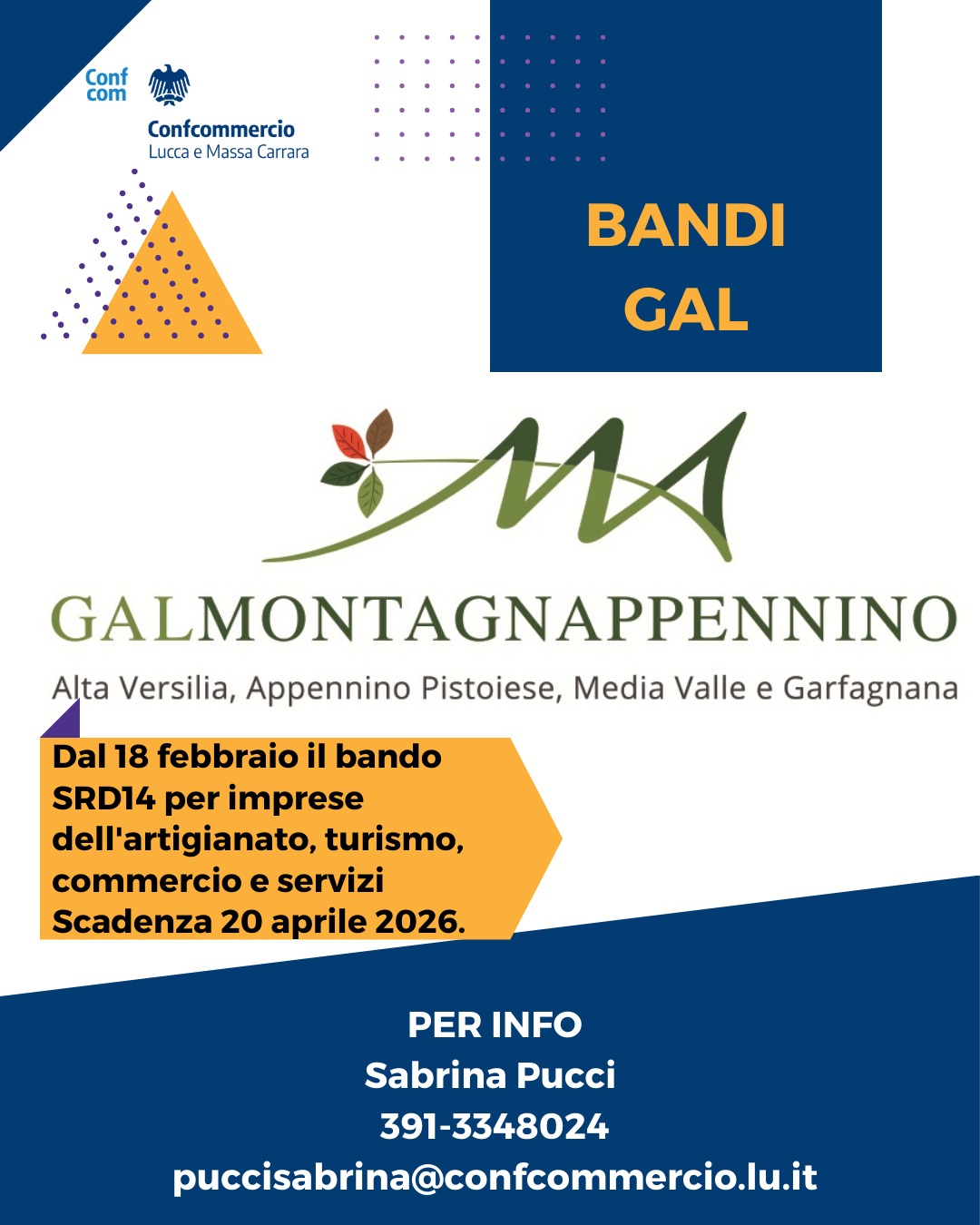 Un nuovo bando del Gal: contributi alle imprese contro lo spopolamento delle aree montane Confcommercio Province di Lucca e Massa Carra rende noto come sia in arrivo un’importante opportunità per le attività del nostro territorio. Si tratta di un nuovo bando del Gal Montagna Appennino, che finanzia investimenti produttivi non agricoli per contrastare lo spopolamento e rendere le aree rurali sempre più attrattive.Le domande si aprono mercoledì 18 febbraio e resteranno aperte fino alle 13 del 20 aprile.Il bando è rivolto a micro e piccole imprese della Media Valle, della Garfagnana e dell’Alta Versilia che facciano parte dei settori:- commercio e turismo,- artigianato;- servizi alla persona e alle impreseL’entità del contributo sarà pari al 50 per cento dell’investimento per le piccole imprese, al 60 per cento dell’investimento per le micro imprese e al 65 per cento dell’investimento per le micro imprese giovanili (under 41).Previsto un contributo minimo di 5 mila, massimo di 40 mila euro, destinato a lavori edili, macchinari, attrezzature, arredi, dotazioni informatiche e spese generali.Per maggiori info e supporto nella presentazione delle domande, i nostri uffici del settore credito sono a disposizione (referente Sabrina Pucci - puccisabrina@confcommercio.lu.it; 0584/618654; 391/3348024).[